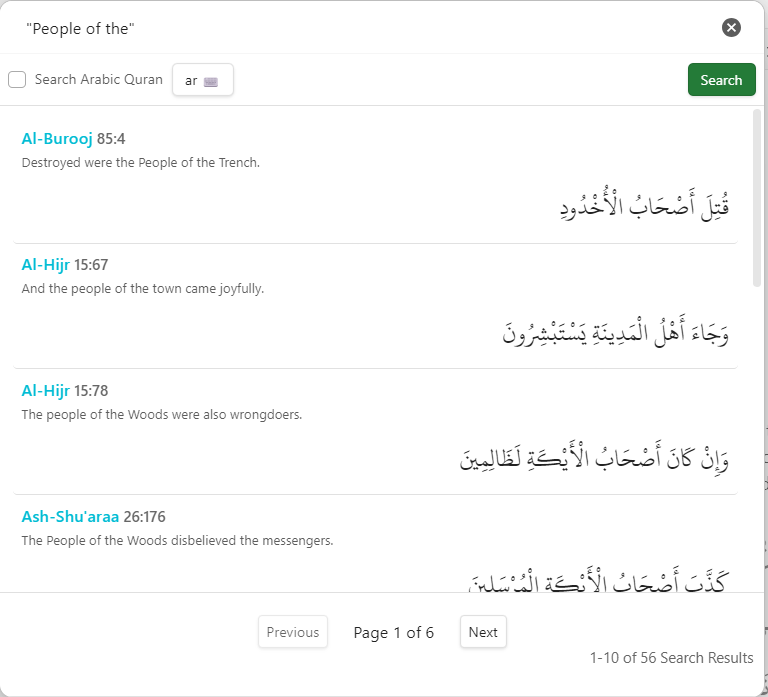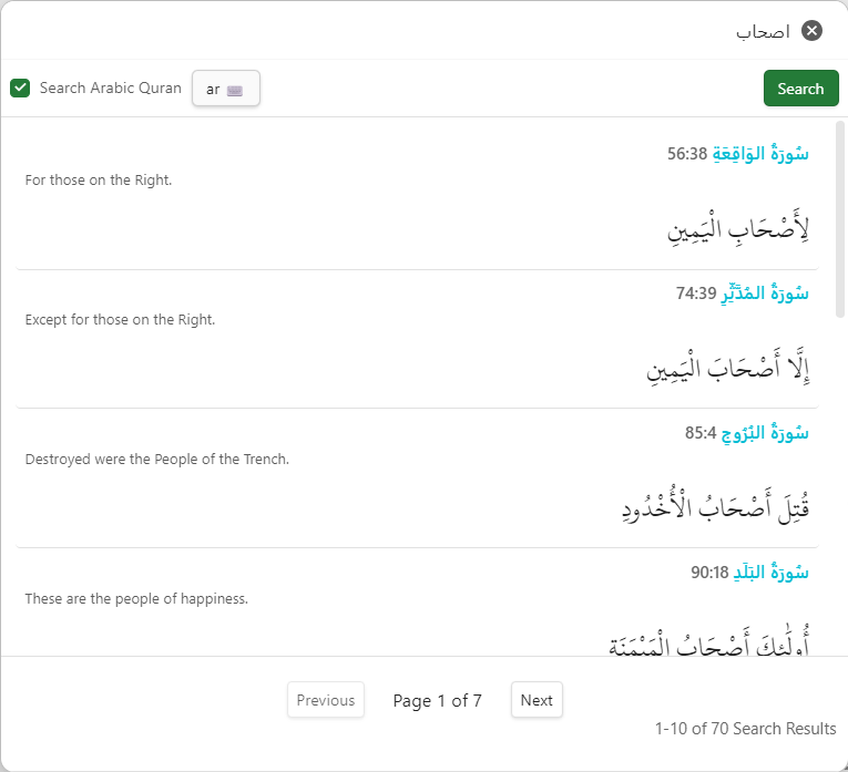 - Toggle Display of verses callout sections: e.g. show Arabic Only, Translation Only