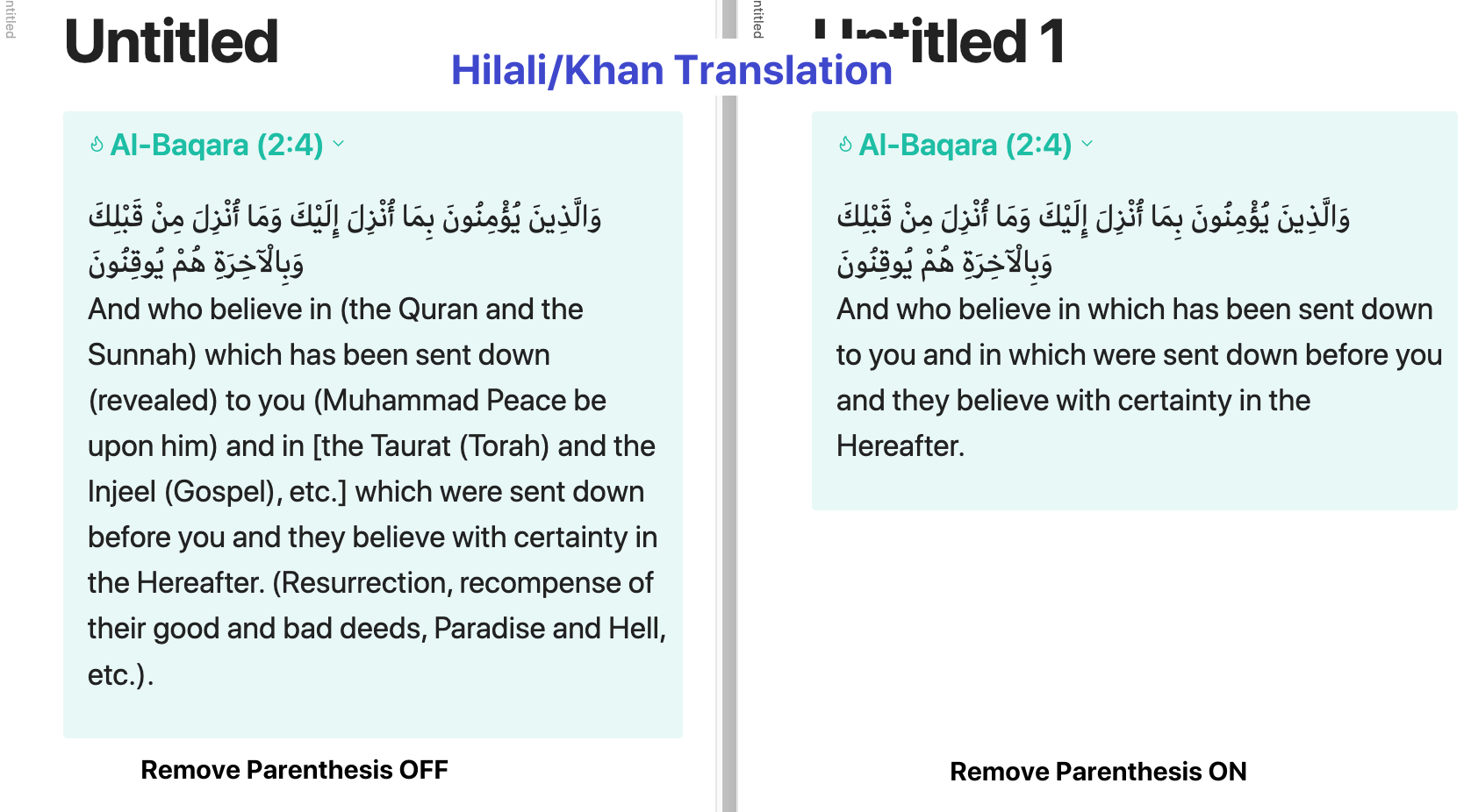 - Some translations provide additional commentary and explanation in parenthesis ( ) and brackets [ ] to give context and allow the translator the opportunity to explain a nuanced, complex term. While this is useful at times, it makes the text very verbose and breaks the flow for the reader. With the toggle enabled, this plugin removes that additional text so that the translation is succinct like the arabic.