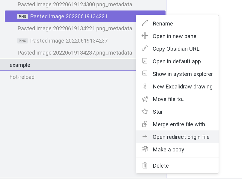 The Redirect: Open redirect origin file command will present a similar interface, but open the markdown file that configured the redirect.