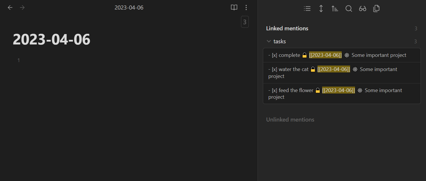 - Points to the completed date on the task (✅ 2023-03-29). This way you can archive tasks created with the