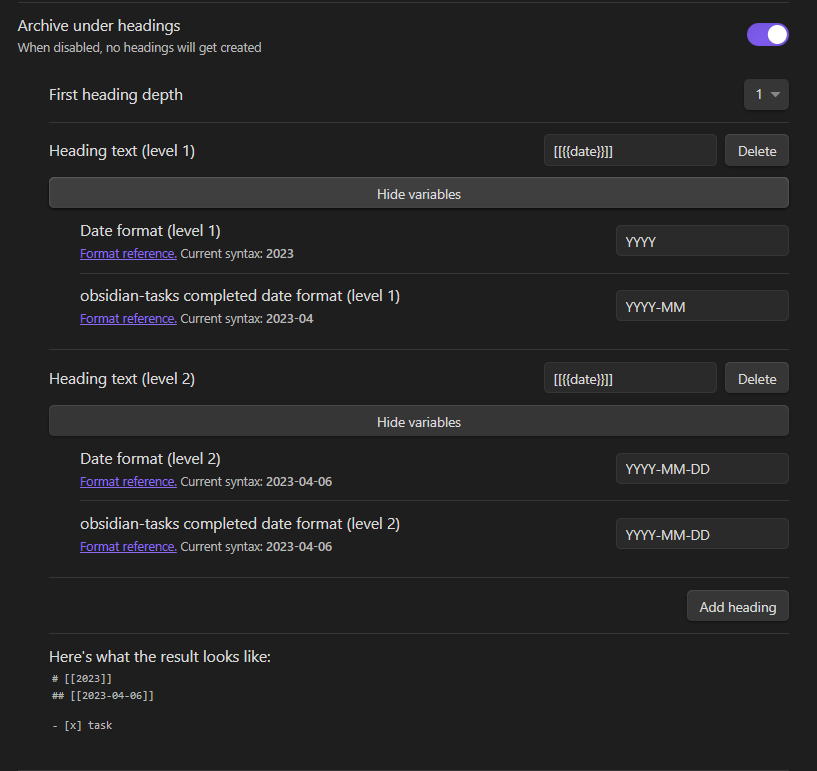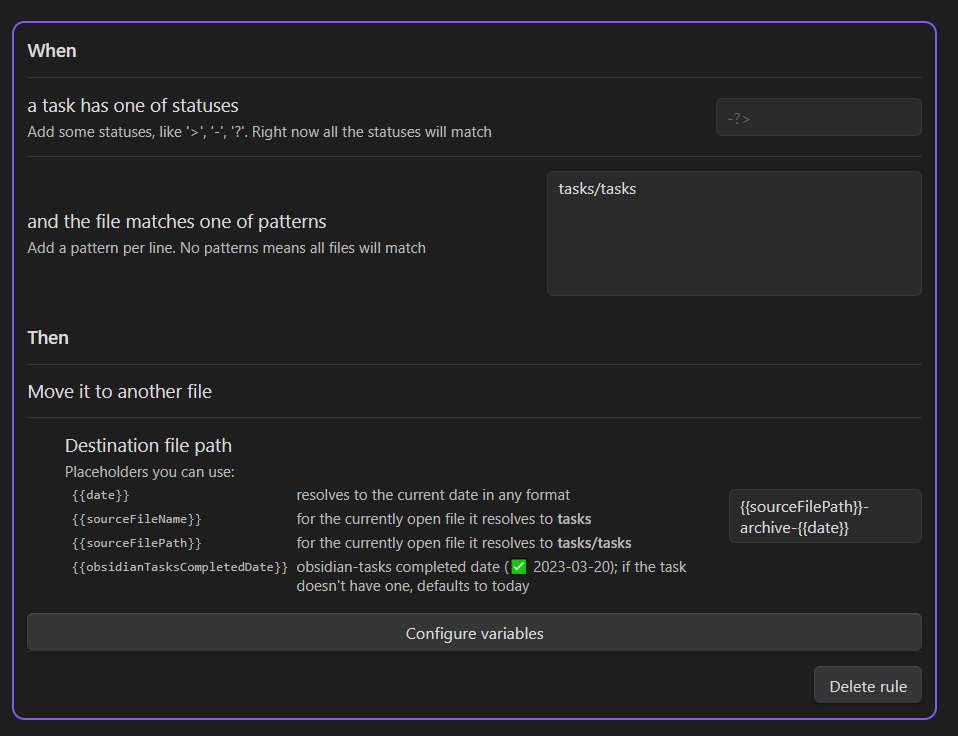 {{obsidianTasksCompletedDate}}- Points to the completed date on the task (✅ 2023-03-29). This way you can archive tasks created with the