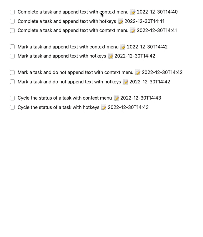 An Obsidian plugin to change task status and append text with hotkeys and right-click context menu.