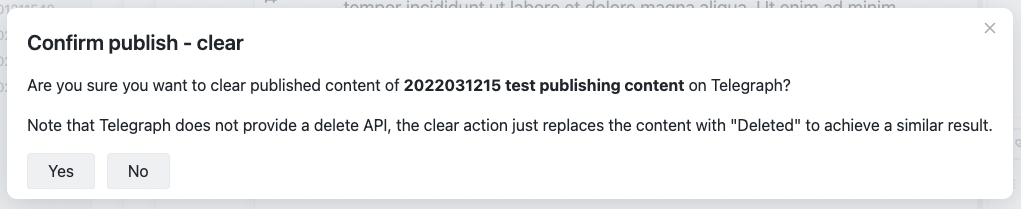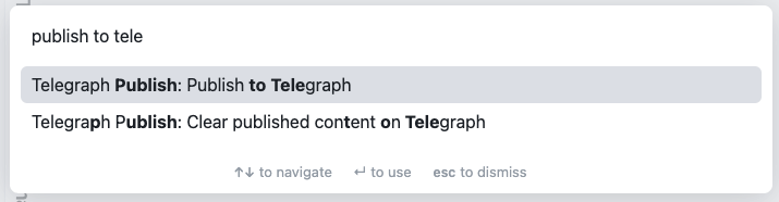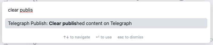 Since Telegraph does not provide a delete page API, the plugin provides a Clear published content on Telegraph command to remove the content of a published page.