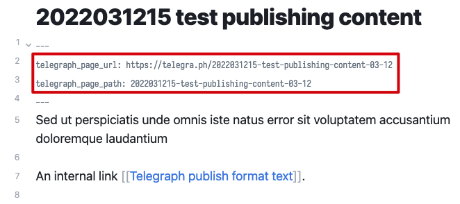 Now go back to the note, and switch to source mode, you can notice that the frontmatter is updated with two new keys: telegraph_page_url and telegraph_page_path. They are used to keep track of the connection from the note to the Telegraph page.