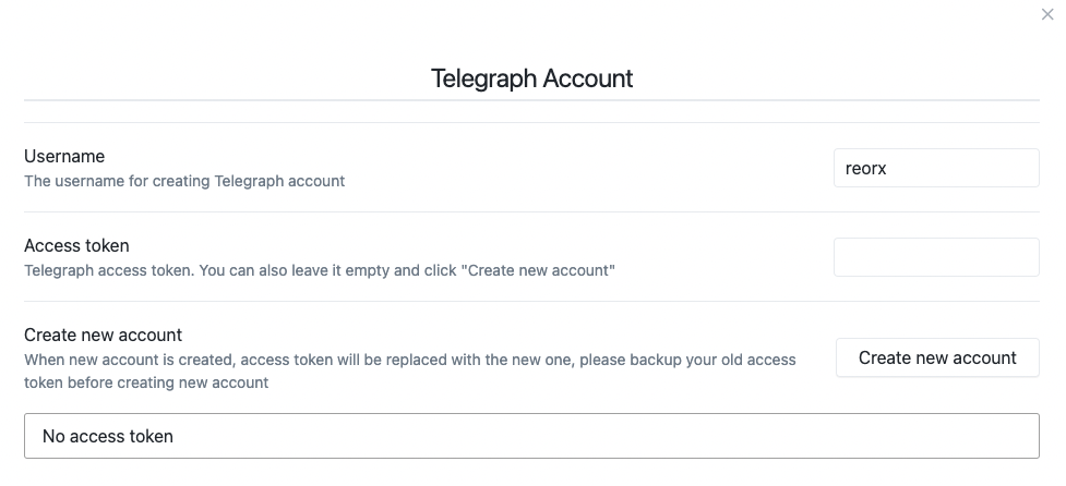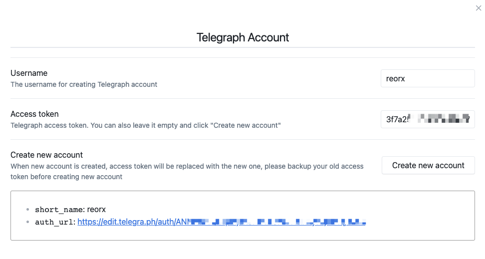 You can see Access token is empty, click the**Create new account" button, the new account will be created and access token will be filled automatically.