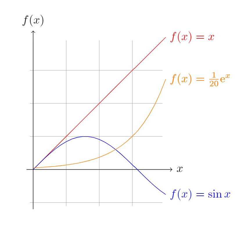 \draw[color=orange] plot (\x,{0.05*exp(\x)}) node[right] {$f(x) = \frac{1}{20} \mathrm e^x$};