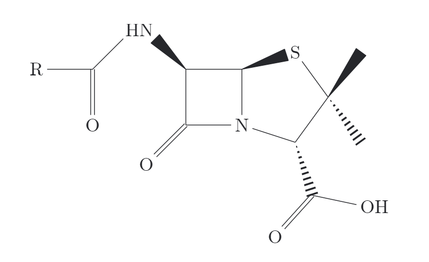\chemfig{[:-90]HN(-[::-45](-[::-45]R)=[::+45]O)>[::+45]*4(-(=O)-N*5(-(<:(=[::-60]O)-[::+60]OH)-(<[::+0])(<:[::-108])-S>)--)}