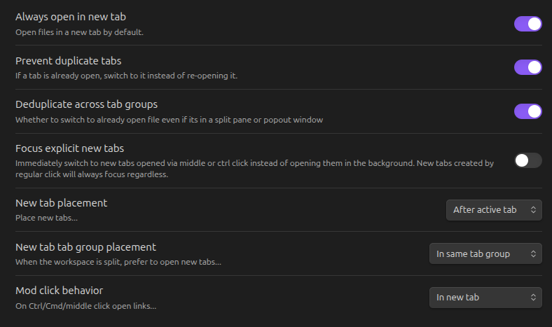 Using these settings can enable a more familiar workflow for those used to working in editors like VSCode. With the "Always open in new tab" toggled, Obsidian will always open files in a new tab, whether they were opened via links, the quick switcher, file explorer, etc. Never accidentally lose your tabs again!