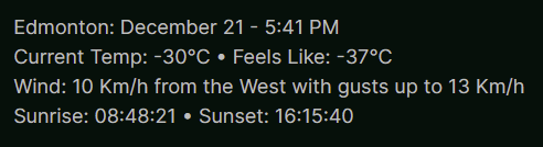 '%name%: %dateMonth4% %dateDay2% - %timeH2%:%timeM% %ampm1%\nCurrent Temp: %temp%°C • Feels Like: %feels%°C\nWind: %wind-speed% km/h from the %wind-dir%^ with gusts up to %wind-gust% km/h^\nSunrise: %sunrise% • Sunset: %sunset%\n'