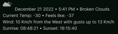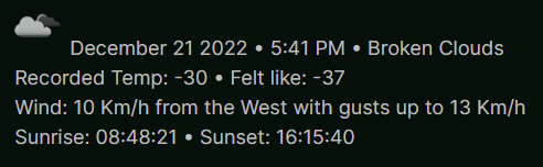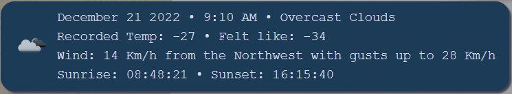 '%icon% %dateMonth4% %dateDay2% %dateYear1% • %timeH2%:%timeM% %ampm1% • %desc%<br> Recorded Temp: %temp% • Felt like: %feels%<br> Wind: %wind-speed% km/h from the %wind-dir%^ with gusts up to %wind-gust% km/h^<br> Sunrise: %sunrise% • Sunset: %sunset%'