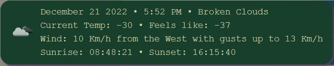 '%icon% %dateMonth4% %dateDay2% %dateYear1% • %timeH2%:%timeM% %ampm1% • %desc%<br> Current Temp: %temp% • Feels like: %feels%<br> Wind: %wind-speed% km/h from the %wind-dir%^ with gusts up to %wind-gust% km/h^<br> Sunrise: %sunrise% • Sunset: %sunset%'