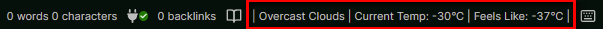 If you want to try the new plugin now you can find the Visual Crossing Weather plugin here. It has some big improvements over the old plugin. It now has 5 locations you can get the weather data for as opposed to just one. I have doubled the number of weather templates from 4 to 8. There are now 2 statusbar strings which can be cycled every 30 seconds. The defaults are the first one has info on todays weather, the second displays info for tommorows weather. Note while this is still a work in progress it has almost every feature working now (Two feature that I still want to add are not yet completed). The documentation is also basically non-existent at the moment although I do have the complete list of current macros created (nearly 4000 already) and it is displayed in an easy to read table format. I have uploaded the main.js file as well if you would like to do a manual install or you could use the BRAT plugin to do the work for you. Anyone willing to Beta test it would be a huge help if they could provide any feedback.
