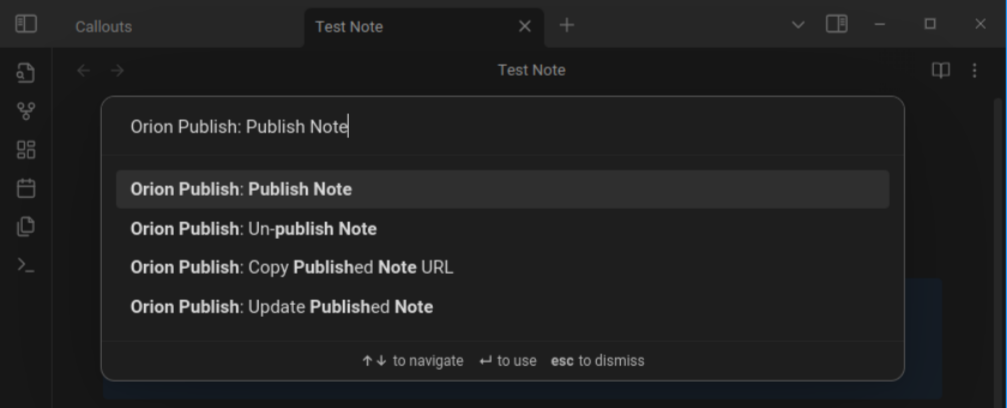 Orion Publish: Publish Note- Publishes the current note to the web.Orion Publish: Update Published Note- Updates the current note on the web.Orion Publish: Unpublish Note- Removes the current note from the web.Orion Publish: Copy Published Note URL- Copies the current note's URL to the clipboard.