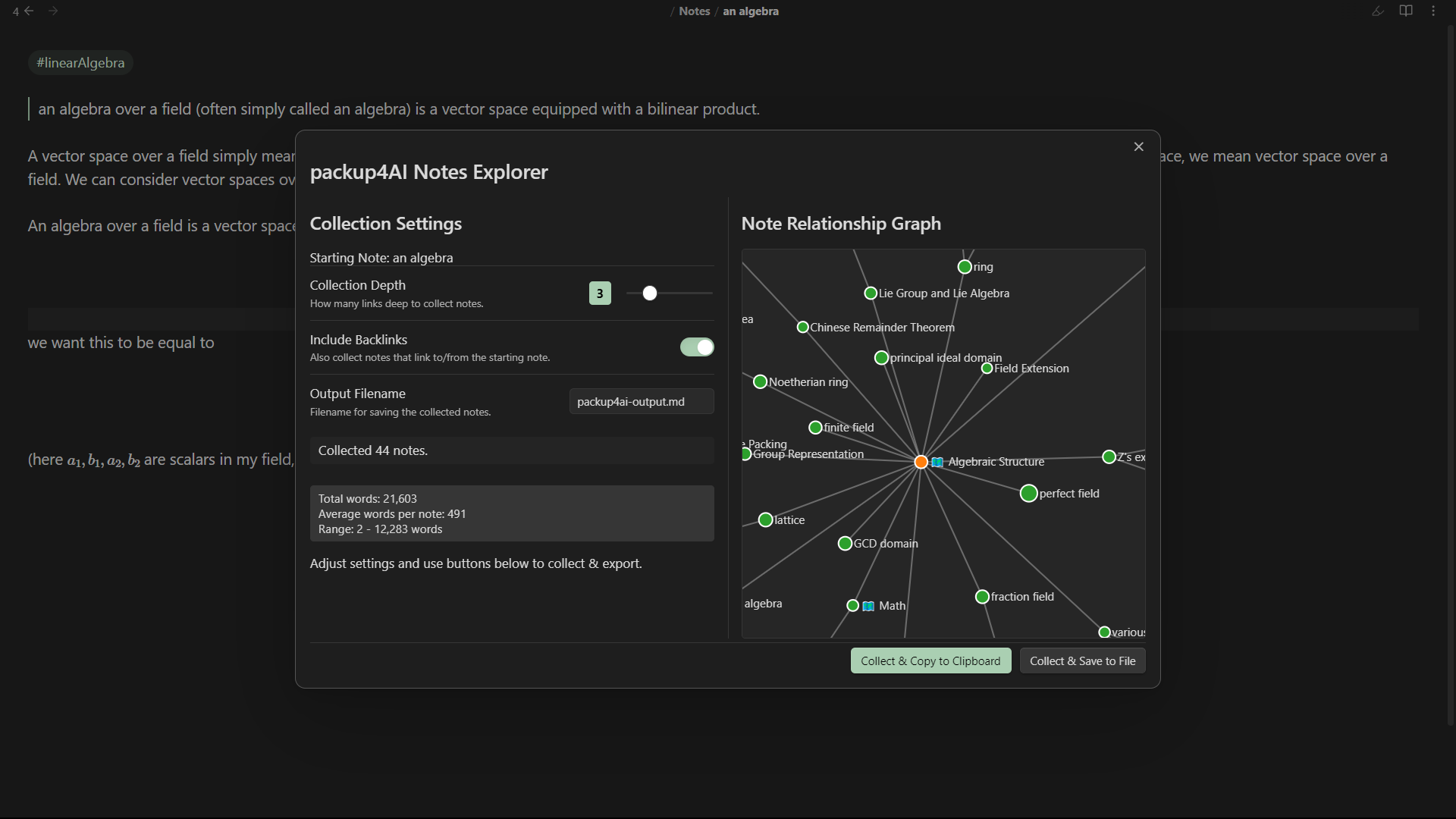 Collection Depth,Include Backlinks, andOutput Filename. You'll see the collection status and word count update here. - Right Pane: See the interactive relationship graph of the collected notes. Hover over nodes for titles and word counts. Click nodes to open them in Obsidian.