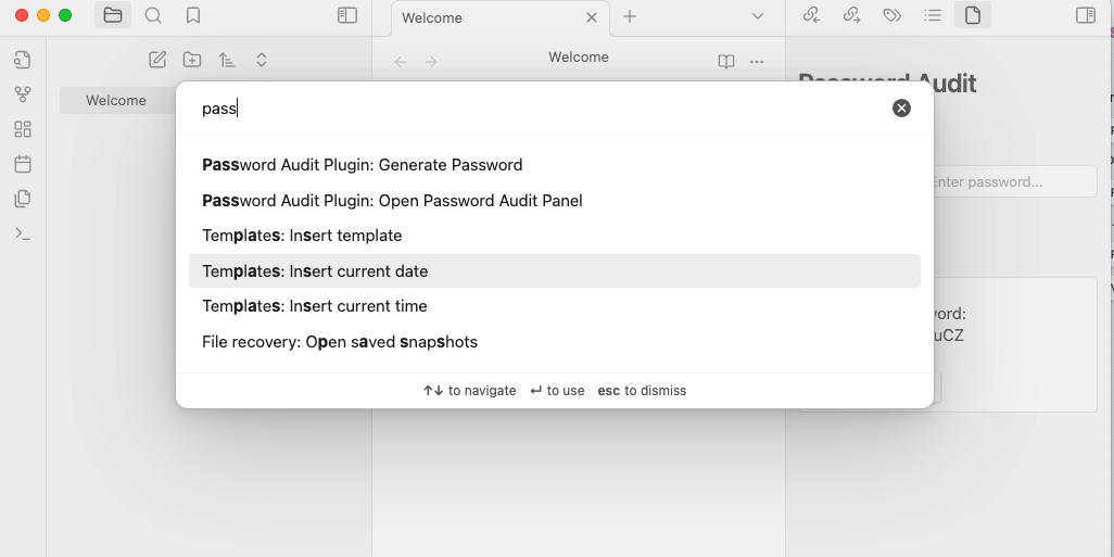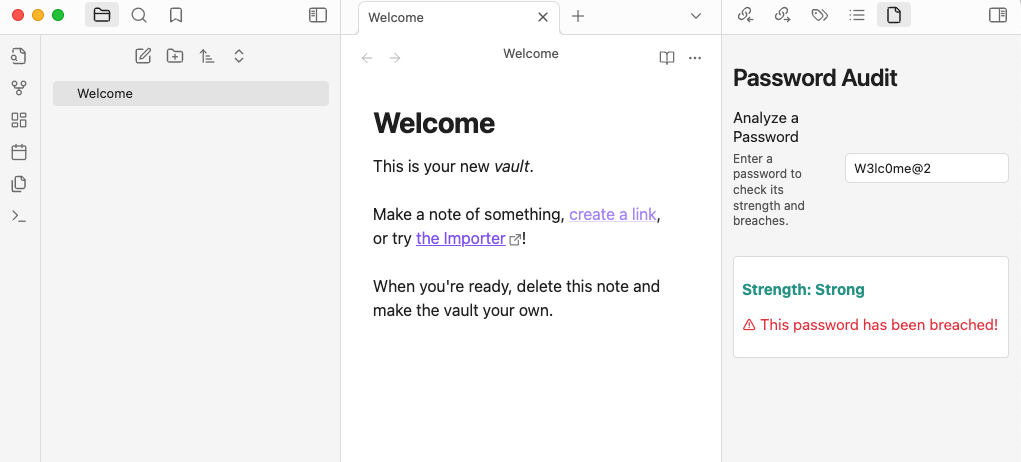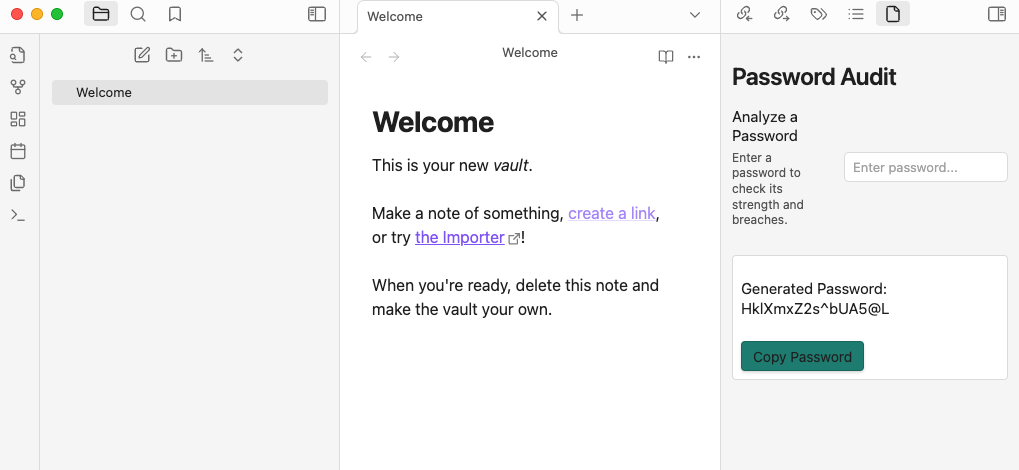 ā ļø Important: Obsidian is not designed for securely storing sensitive information like passwords. Use this plugin only for auditing and generating passwords, not for storing them. Always use a dedicated password manager for secure storage.