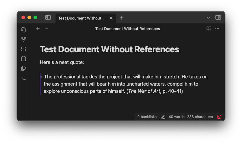 ![A sample document after pasting, which includes the quote and a citation in the format [@pressfield2002, p. 40-41]](https://raw.githubusercontent.com/brokensandals/obsidian-paste-quote-plugin/HEAD/docs/cite-refs-post.png)