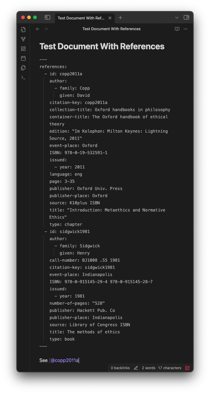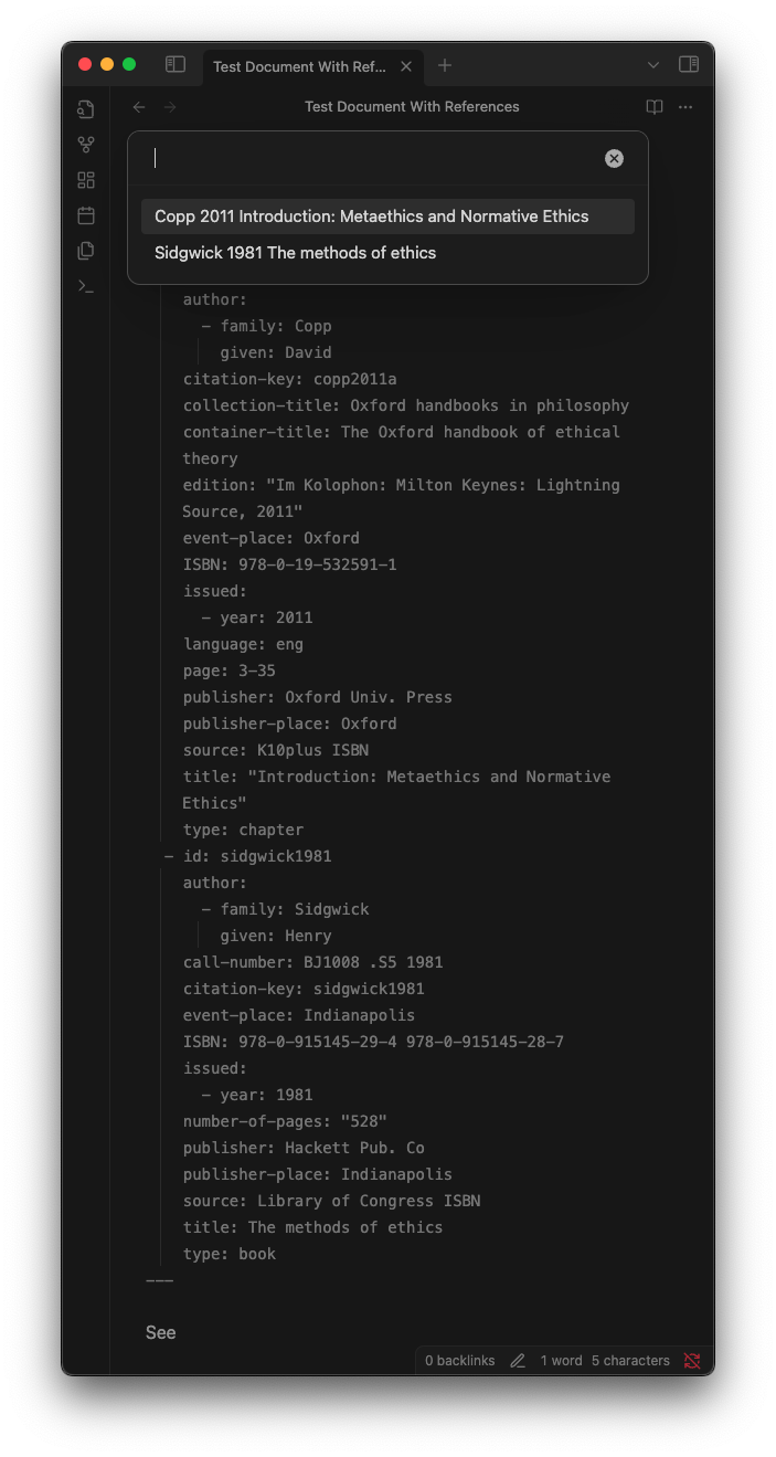 The plugin also contains a command to help paste references from e.g. Zotero into the references section of the note's front matter, and a command to insert a Pandoc-style citation for an item from the references section.