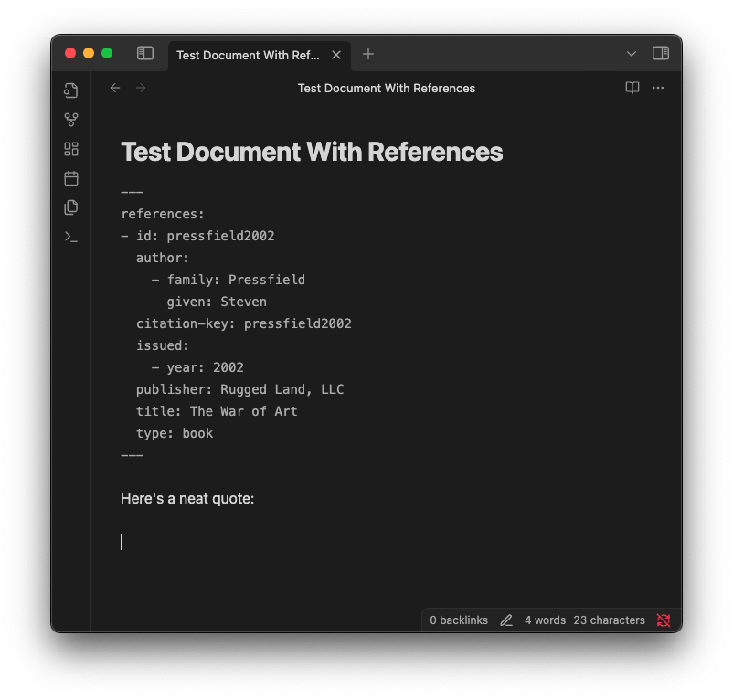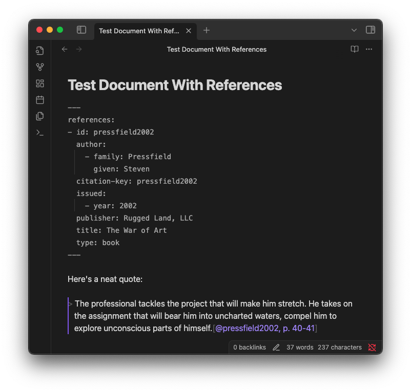 If your document does have a references section in its frontmatter, then the plugin will try to find the correct reference for the quote based on the title, and generate a Pandoc-style citation using the corresponding id. Example: