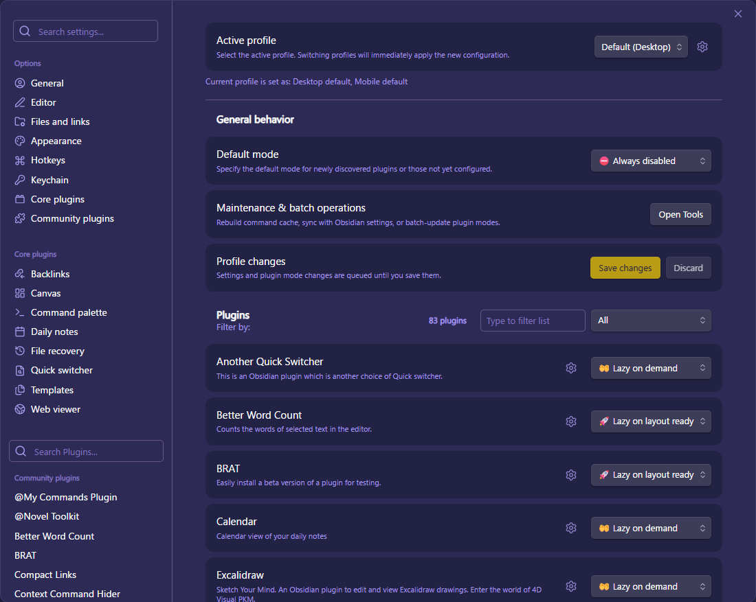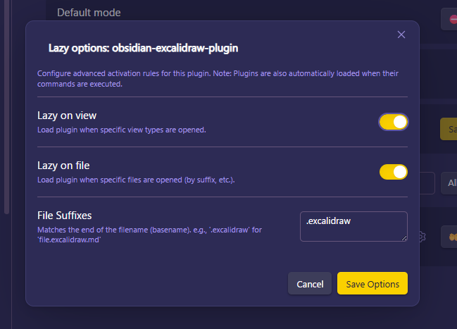 - Lazy on demand: Loads when you run one of its commands, when a specified view type is opened, or when a specific file type (e.g. excalidraw.md) is opened. You can configure