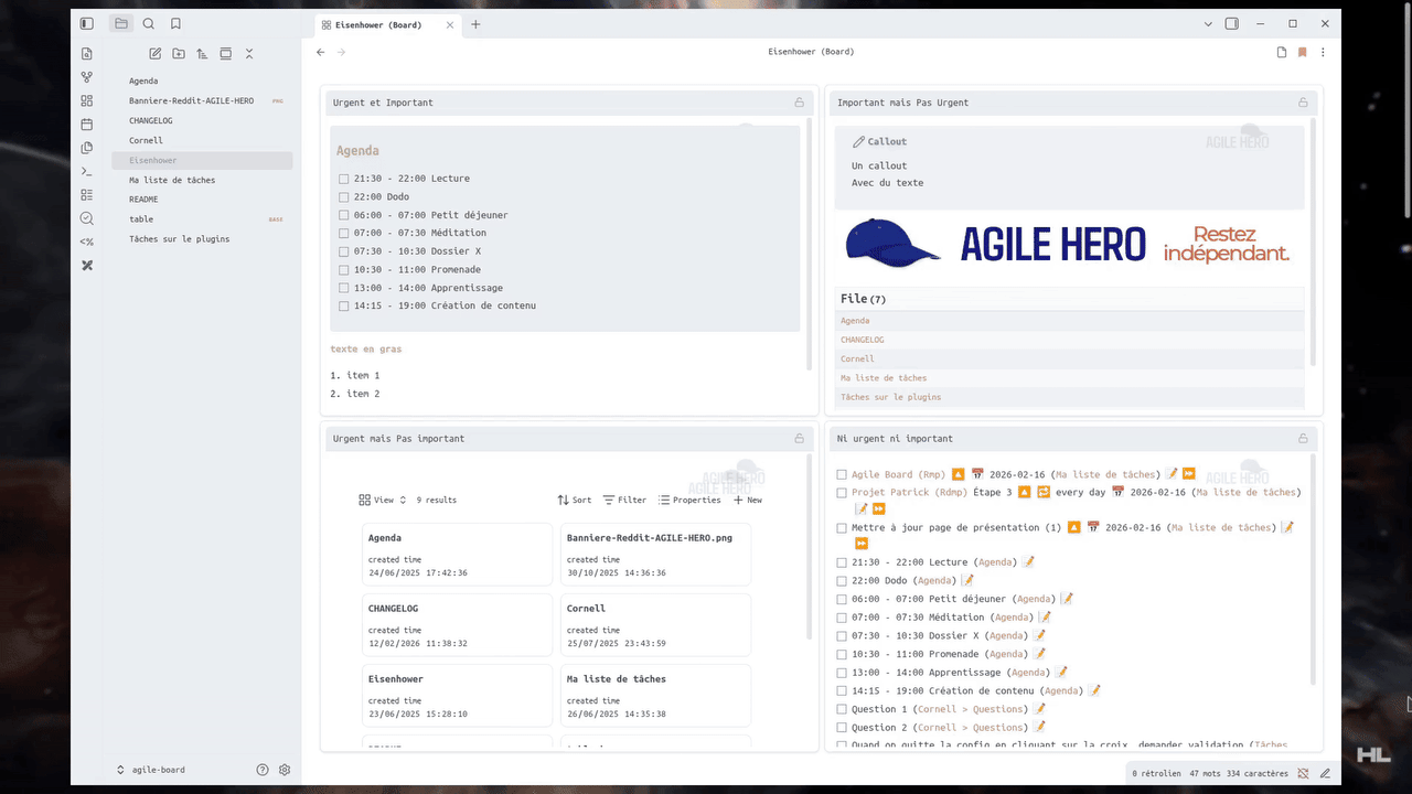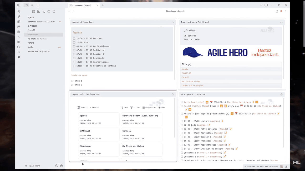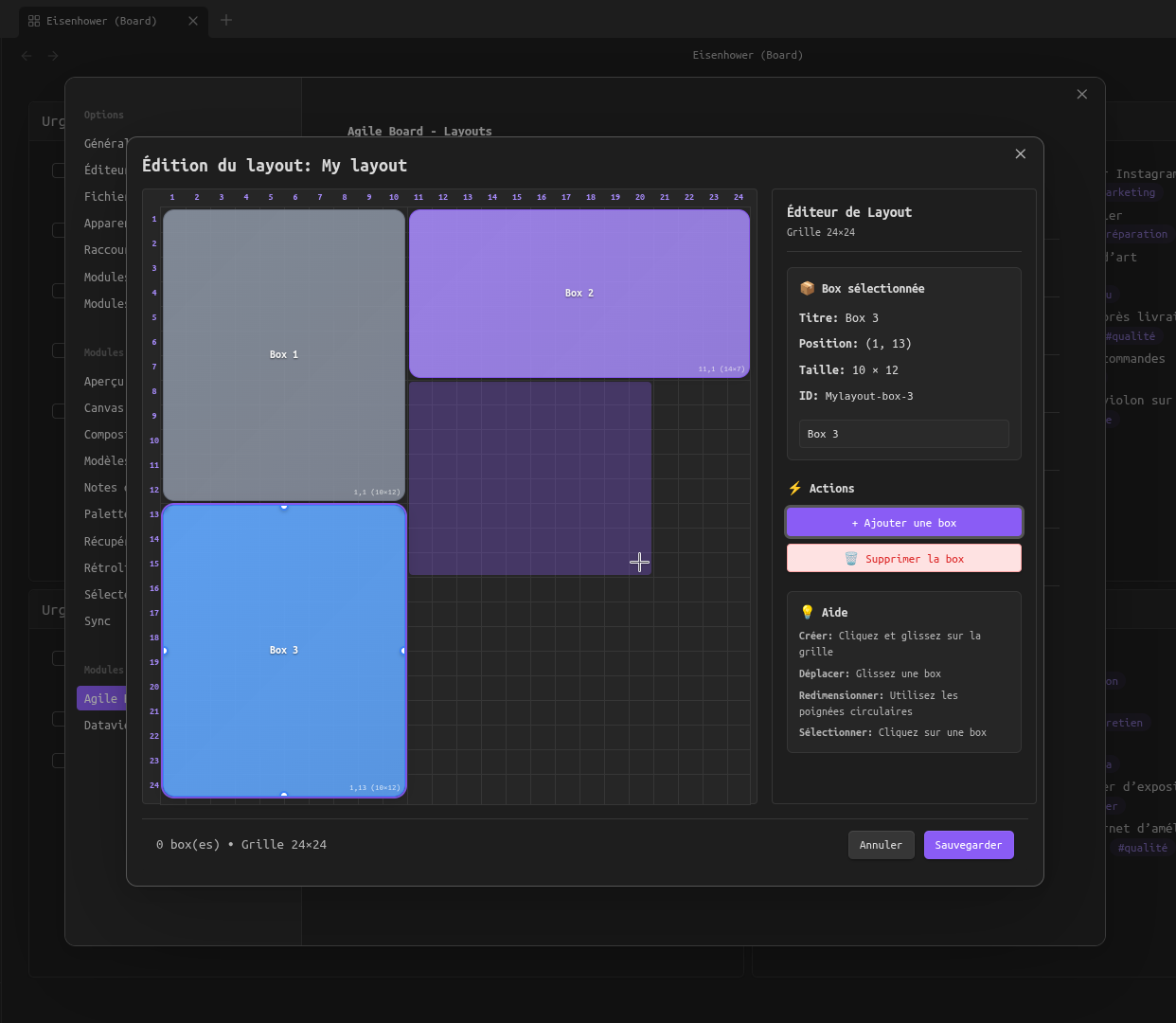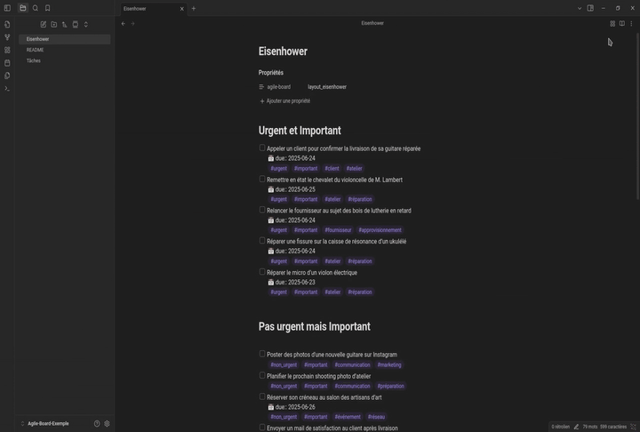 Agile Board is a plugin for Obsidian that transforms your notes into visual boards. Each layout is based on a template (like the Eisenhower matrix) defined on a 24x24 grid. Sections appear as editable frames ("boxes"): you can write, insert tasks, Dataview/Tasks queries, etc.