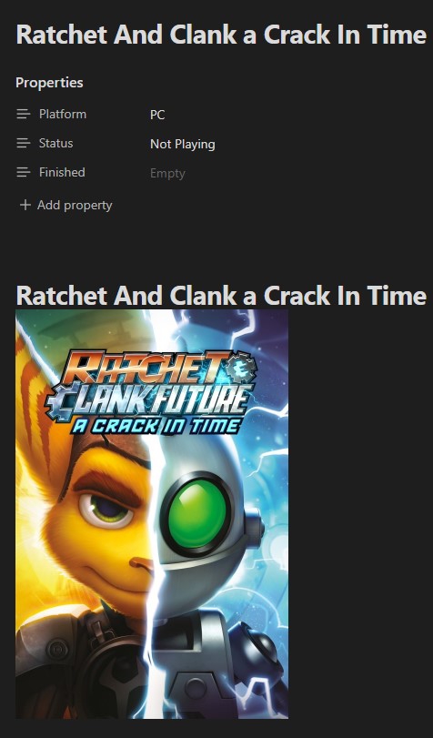 Gaming Backlog Template.mdsnippet:<%* const title = tp.file.title; const urlTitle = title.trim().replace(/\s+/g, "+"); tR += `---\nPlatform: PC\nStatus: Not Playing\nFinished: \n---\n\n# ${title}\n\n`; // Call the new command after the title await app.commands.executeCommandById('steamgriddb-embedder:embed-steamgriddb-image-for-note'); tR += `\n## Notes:\n-\n`; %>Example of embedded image after using Templater: