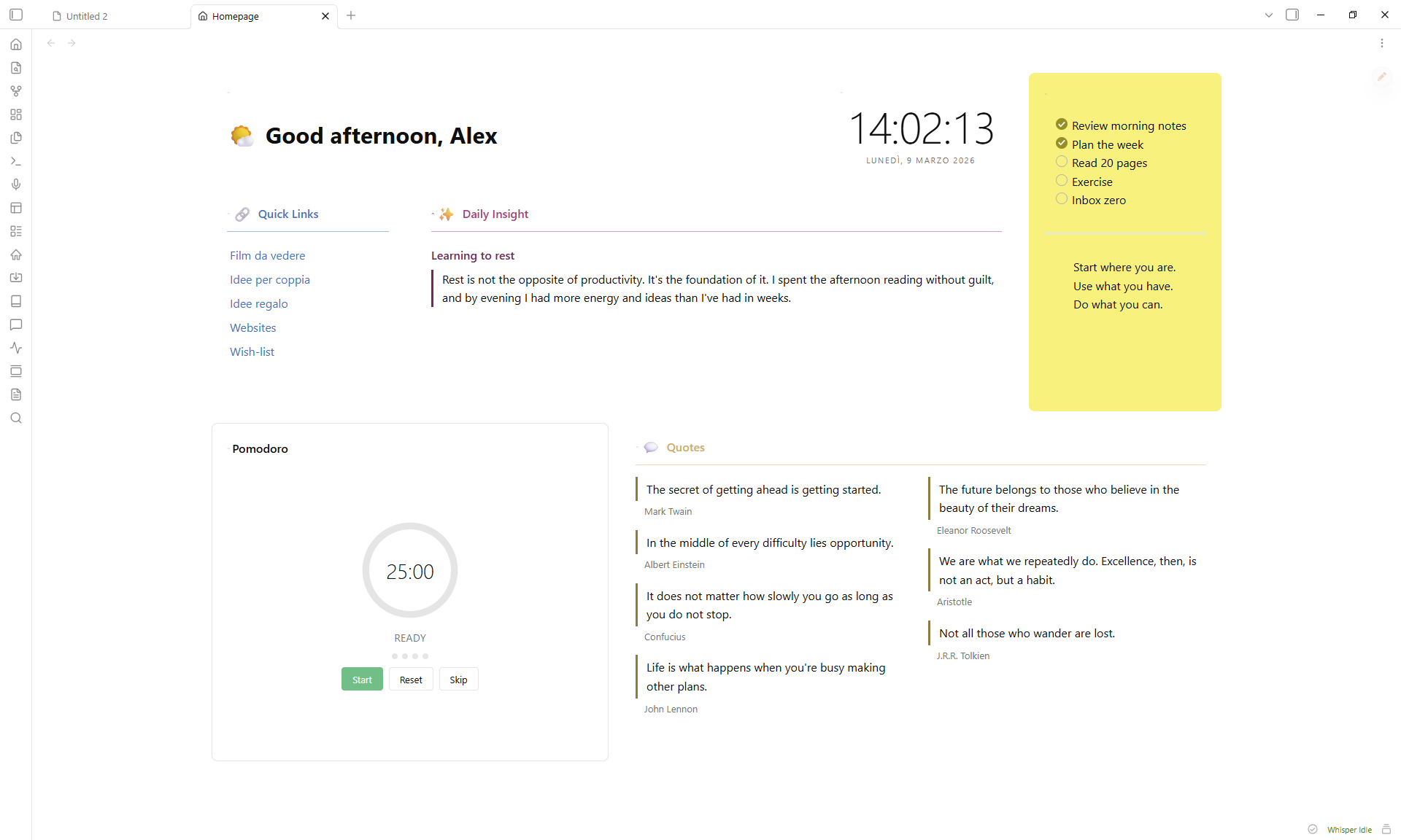 A composable, drag-and-drop homepage with 15 native block types — no Dataview required.
