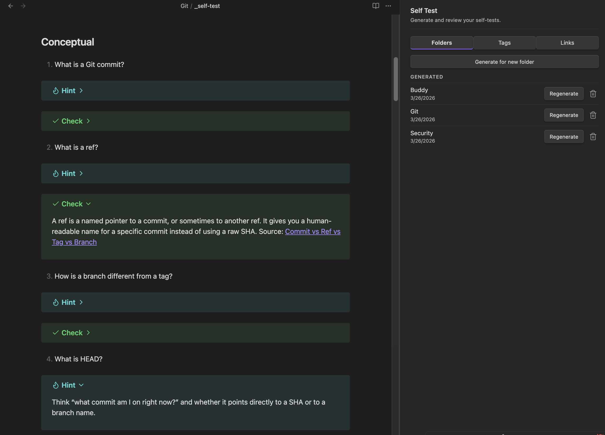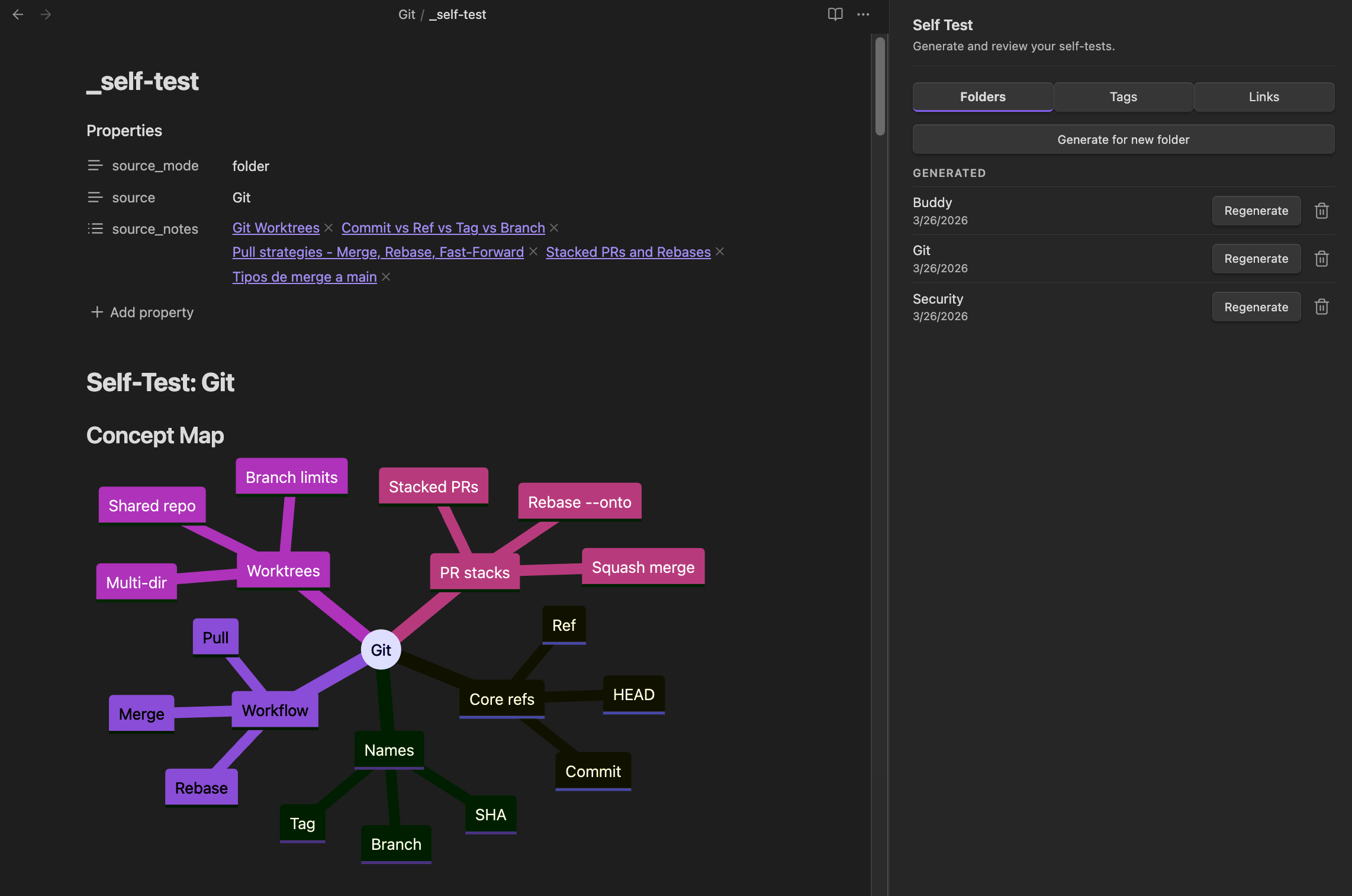 - Right-click any note in the file explorer and select Generate self-test