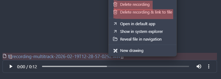 Moves the audio file to the system trash and removes the corresponding embed link from the editor. Available when right-clicking on a link in the editor or on an embedded player.