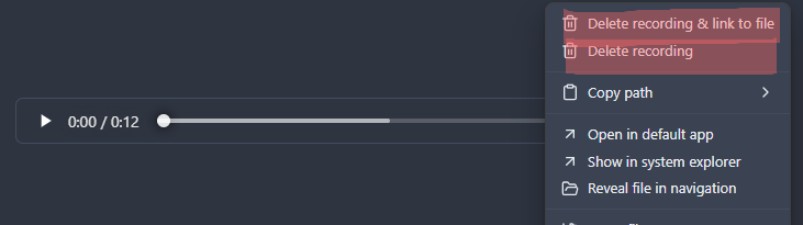 Right-click on an audio file in the File Explorer, on an audio embed link in the editor, or on an embedded audio player to access these actions: