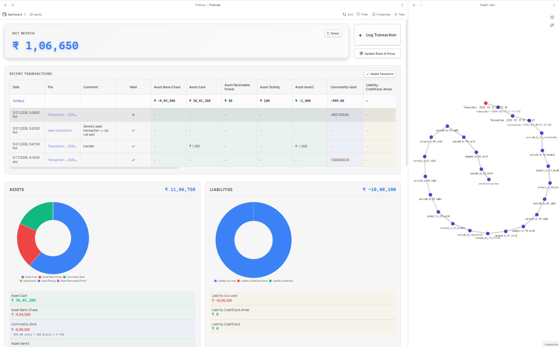 - Double-Entry Accounting: Track assets, liabilities, income, and expenses using frontmatter properties in your daily notes or dedicated transaction files. The plugin employs a strict Zero-Sum rule for transaction validity (