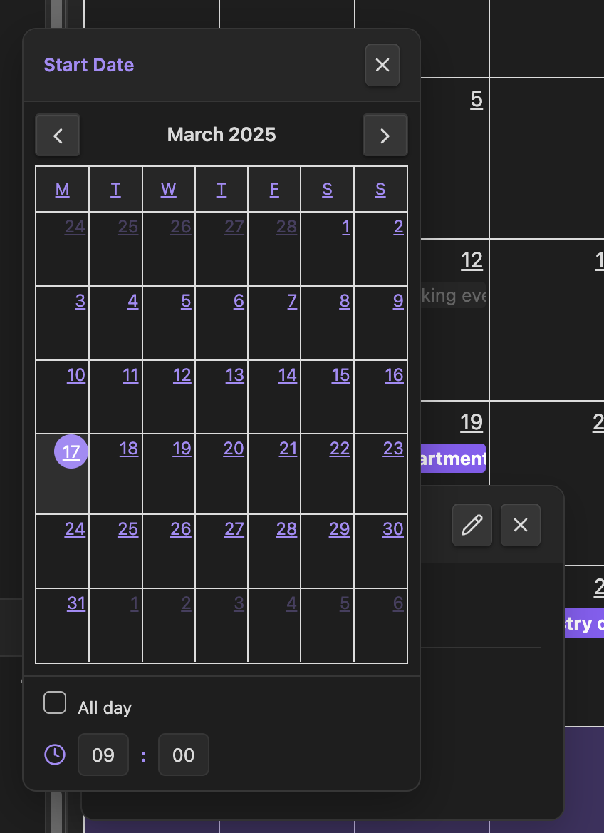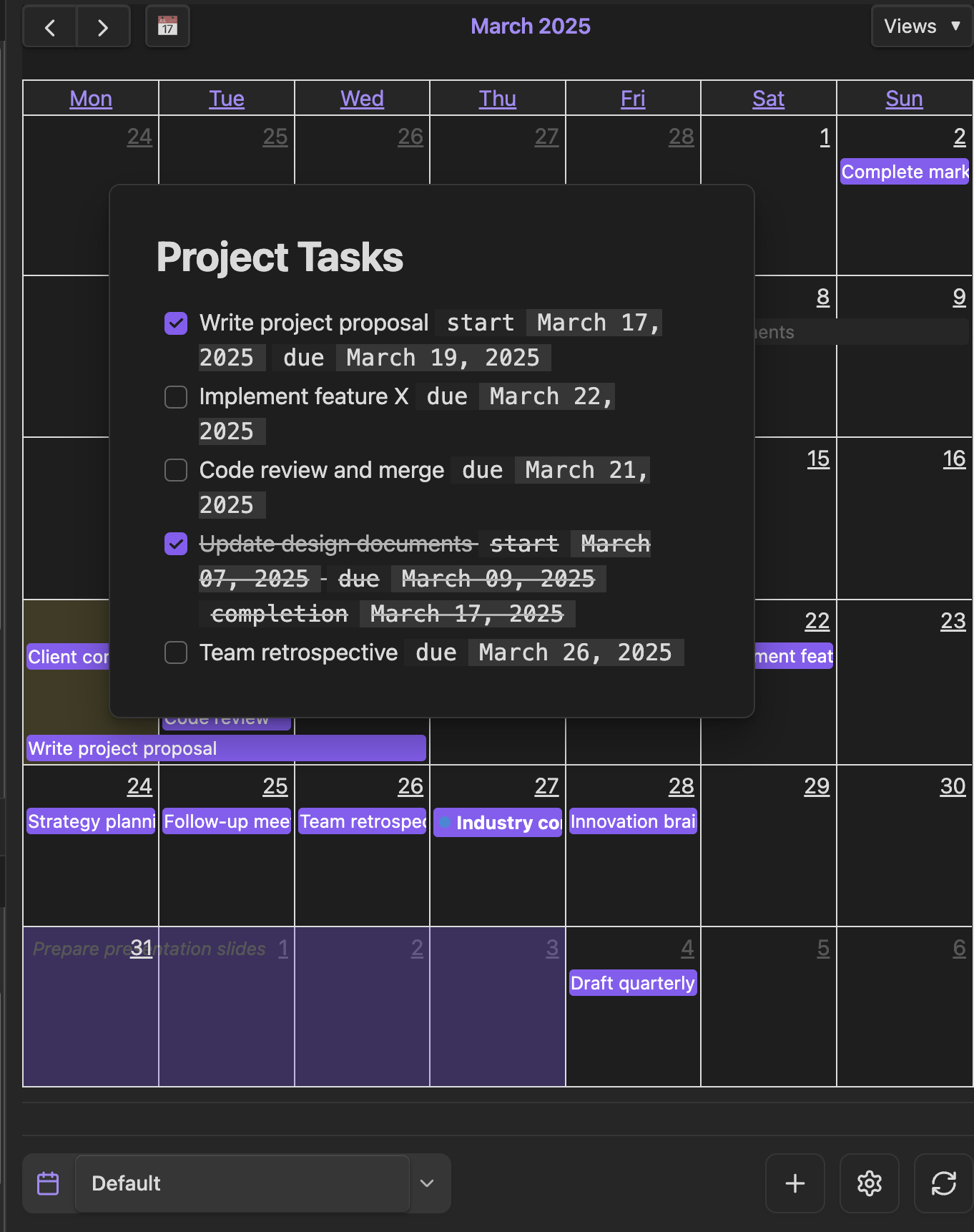 [due:: YYYY-MM-DD]to any checklist item to make it appear on the calendar. Use[start:: YYYY-MM-DD]together with[due:: YYYY-MM-DD]for multi-day tasks, or append a time like[due:: YYYY-MM-DDTHH:mm]for timed events. Tasks can live anywhere in your vault — the plugin uses Dataview to discover them automatically. -
