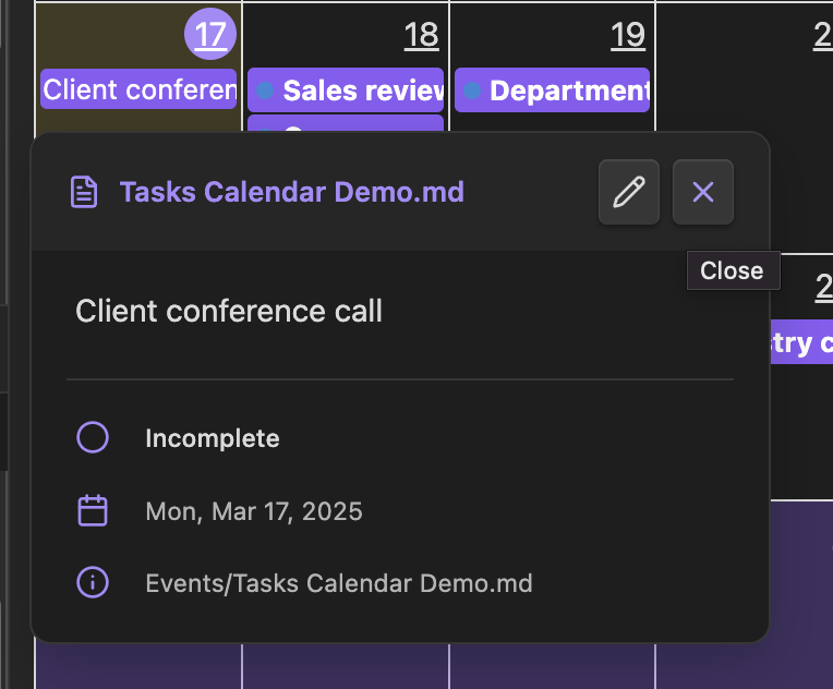 Tasks Calendar works seamlessly with the Tasks plugin as both share similar philosophies for task management: