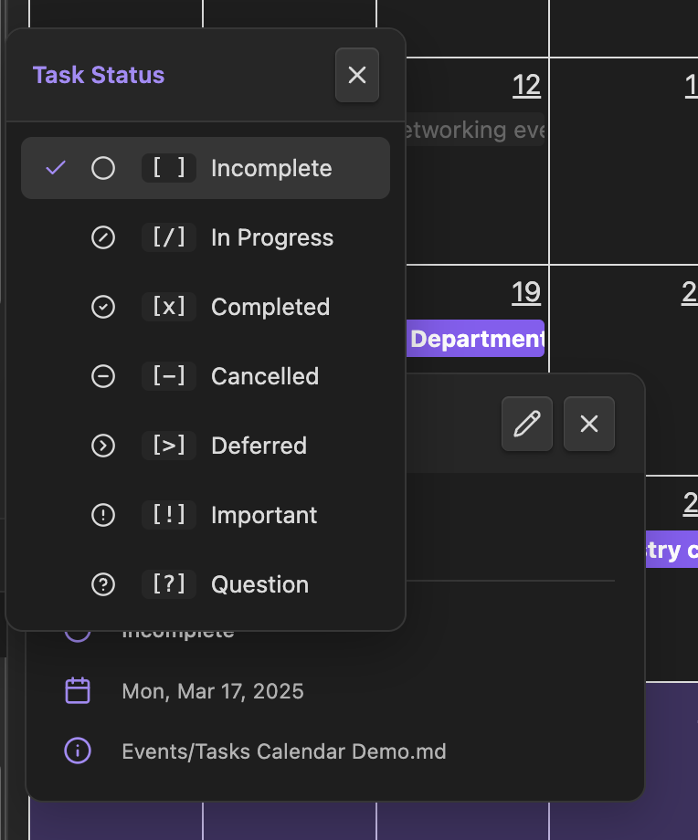 File property tasks Add status and date properties to your frontmatter to treat entire notes as tasks. The file name will display as the task title on the calendar.