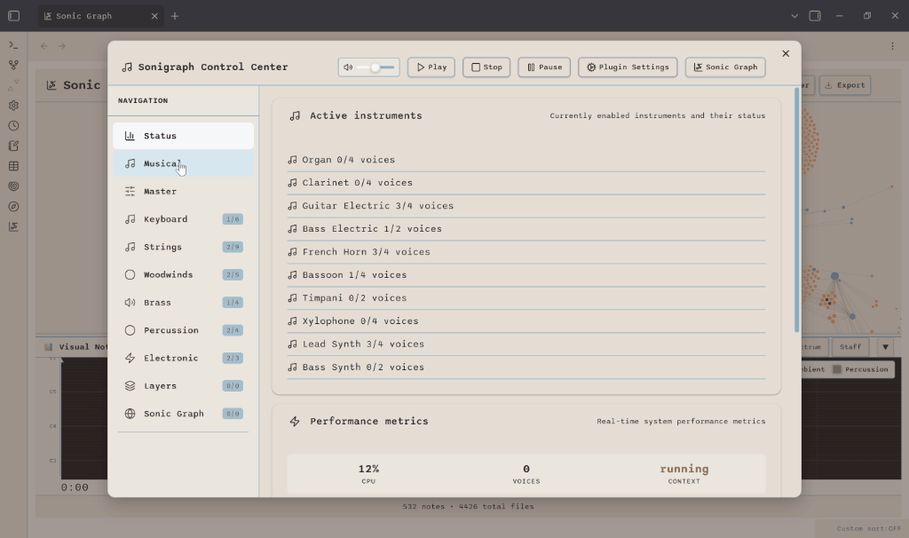 Sonigraph turns your Obsidian vault into an interactive musical instrument. The plugin analyzes your vault's structure - notes, links, tags, and metadata - then generates real-time orchestral music that represents your knowledge graph.
