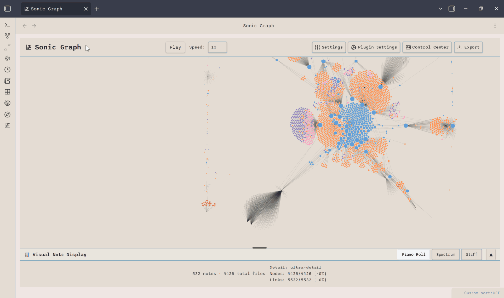 Sonigraph is an Obsidian plugin that maps your vault's structure to music. Notes become instruments, connections become melodies, and your knowledge graph becomes an interactive orchestral composition you can explore, visualize, and export as audio.