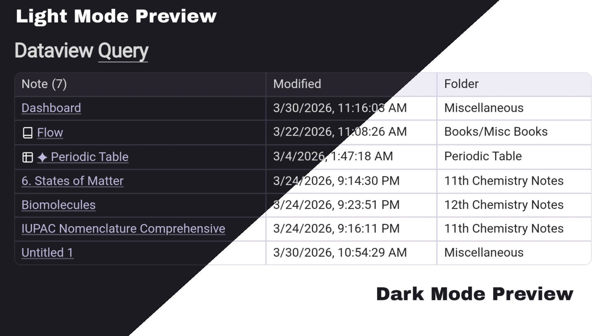 This renders a live table with clickable note links, last-modified timestamps, and folder paths.