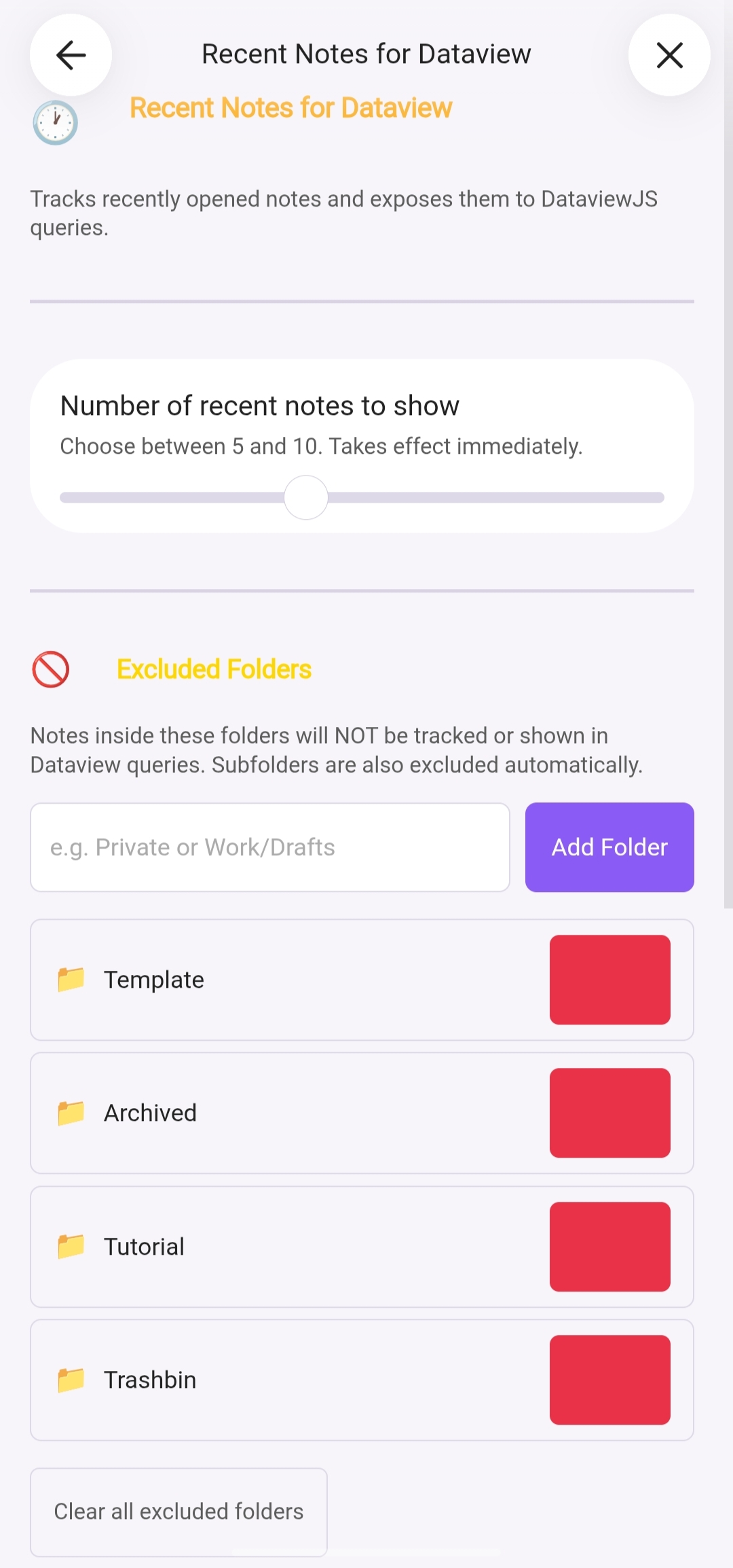 PrivateblocksPrivate/Journal/,Private/Archive/, etc. - Notes already tracked inside a newly excluded folder disappear immediately from Dataview output — no restart required