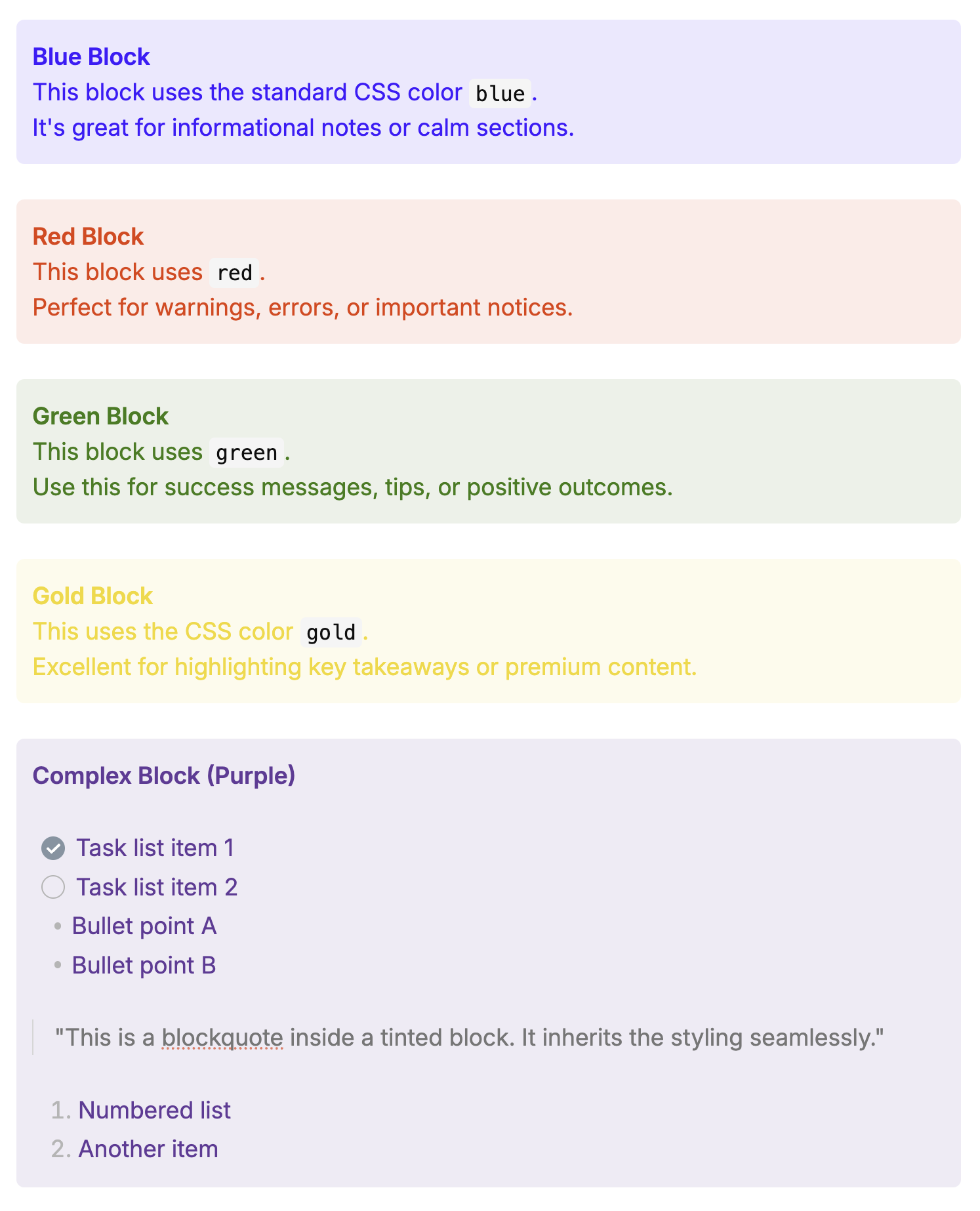 - Rich Content Support: Works perfectly with bullet lists, numbered lists, and blockquotes inside the colored block.