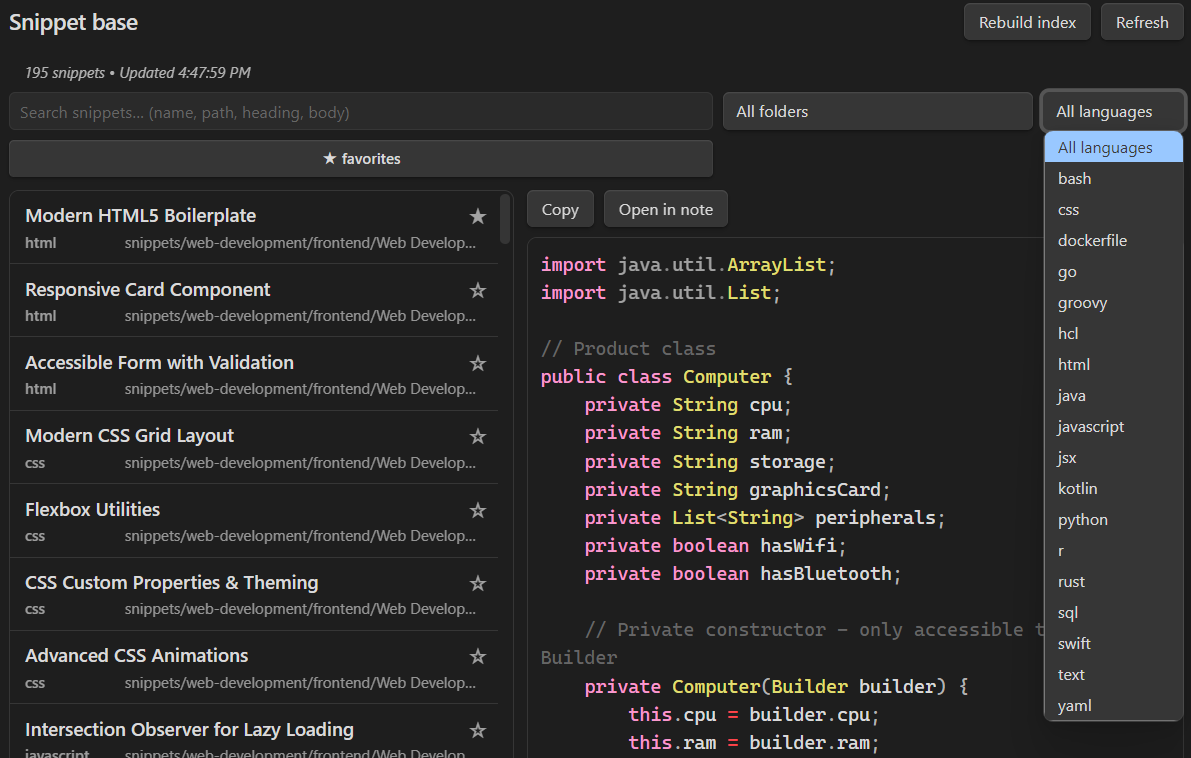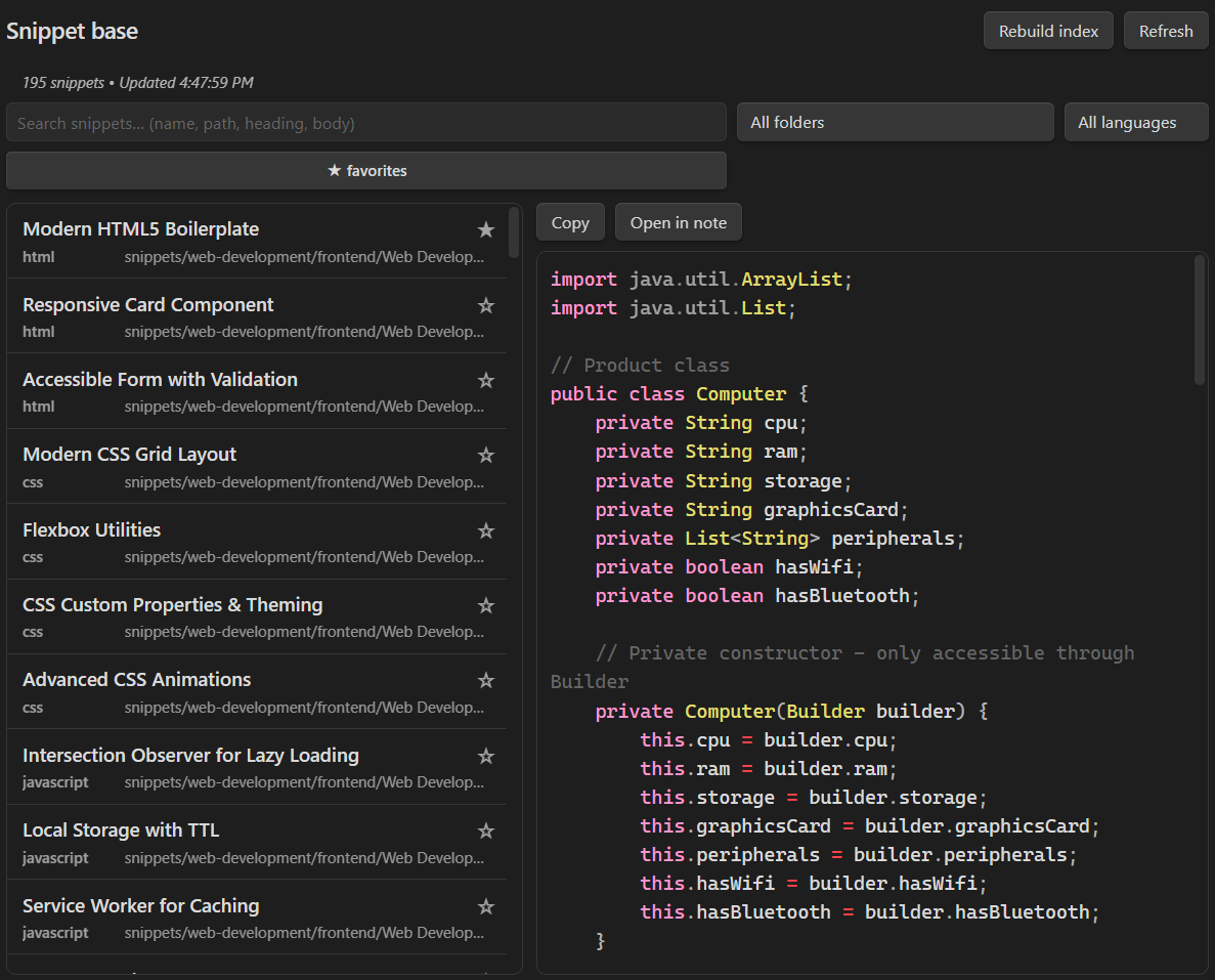 - Fast Performance: Optimized for large vaults with hundreds of snippets