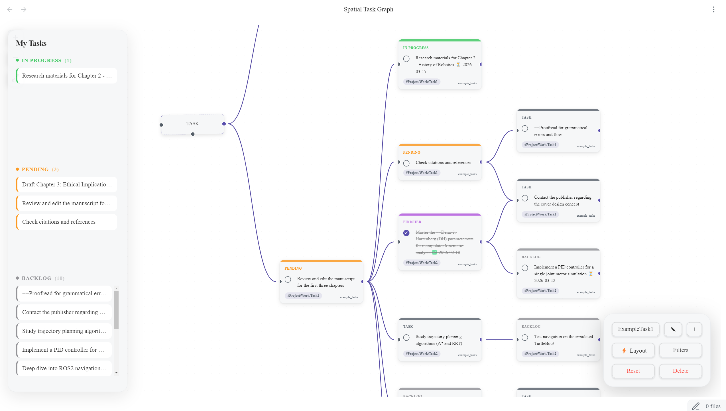 - Drag-to-Create: Drag a connection line to an empty space to instantly open the creation modal. The new task is automatically appended to the parent file and linked.