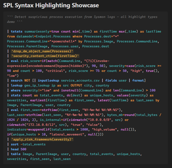 - Full SPL syntax highlighting with 11 token types: commands, functions, keywords, operators, strings, numbers, fields, macros, comments, pipes, and brackets
