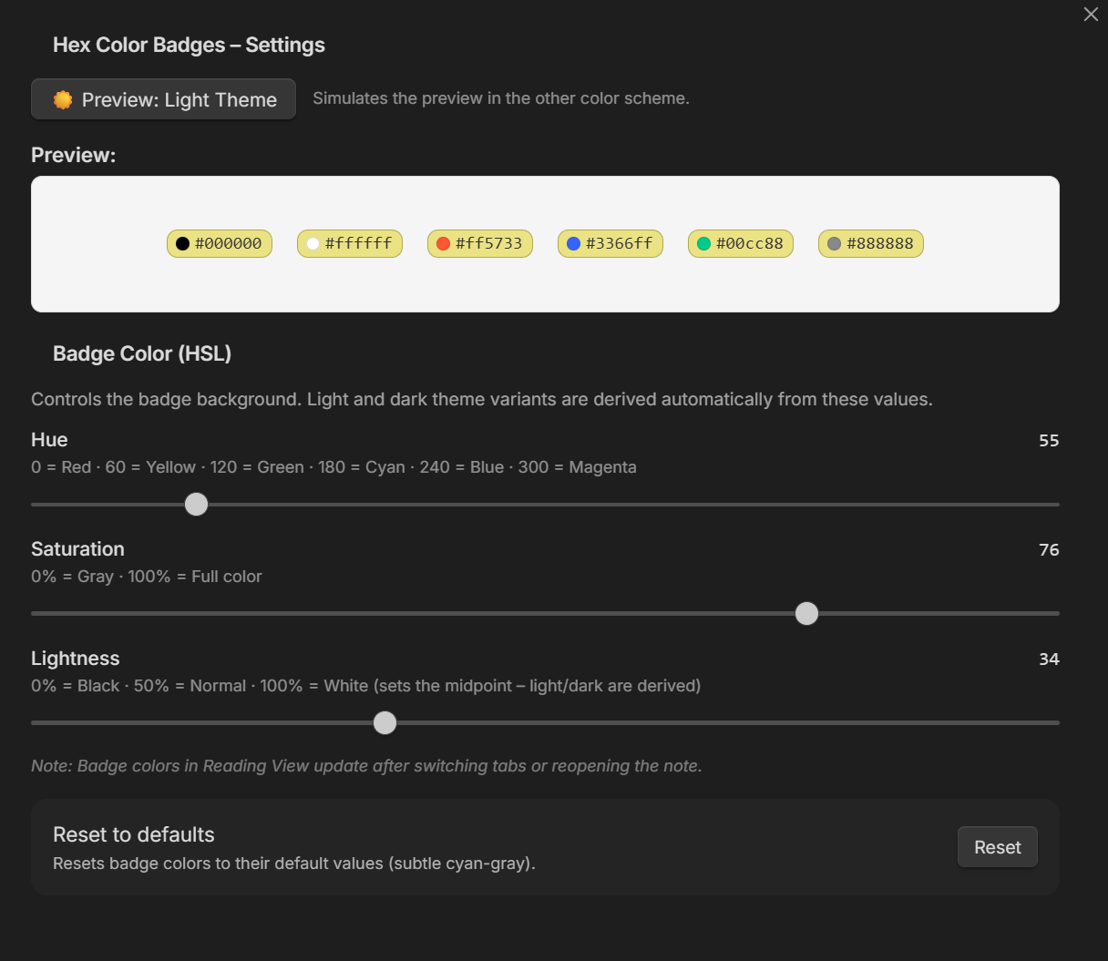 - Customizable badge colors — three HSL sliders (Hue, Saturation, Lightness) control badge appearance; light and dark theme variants are derived automatically