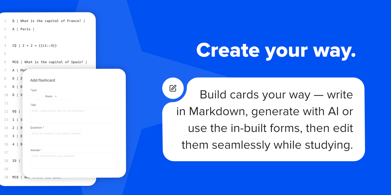 - Markdown-first — flashcards live inside your notes, linked to the knowledge they came from.