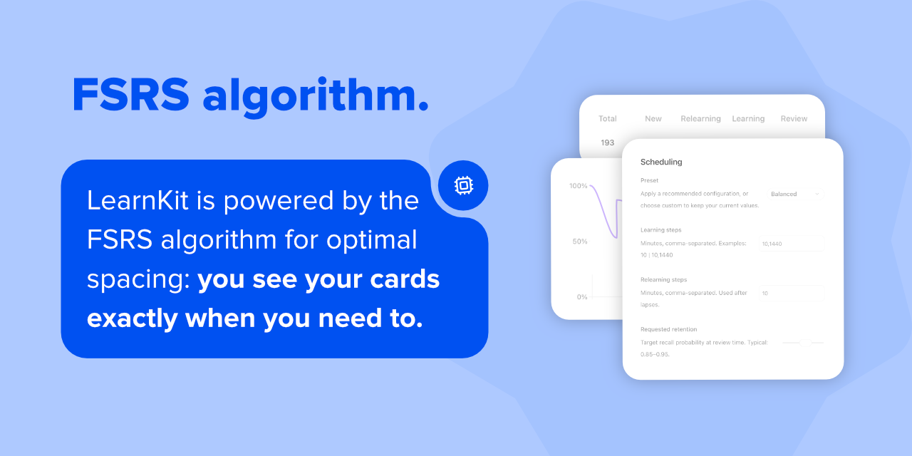 FSRS scheduling in LearnKit is powered by FSRS-6 via open-spaced-repetition/ts-fsrs.