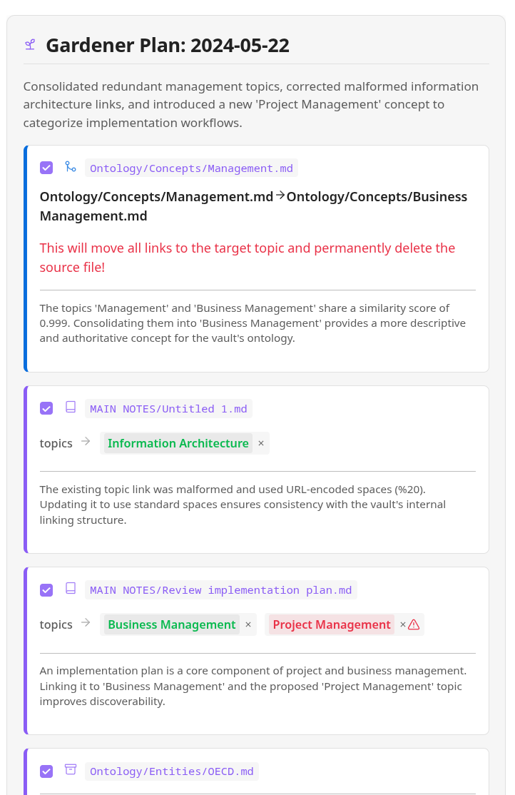 A garden left untended becomes a jungle. The Gardener is a proactive agent that understands your personal ontology. It works in the background, analyzing your notes to find missing tags, suggesting new conceptual links, and proposing structural improvements. It never alters your files silently. Instead, it generates an interactive "Gardening Plan" for you to review, approve, or reject. It takes the chore out of Personal Knowledge Management.