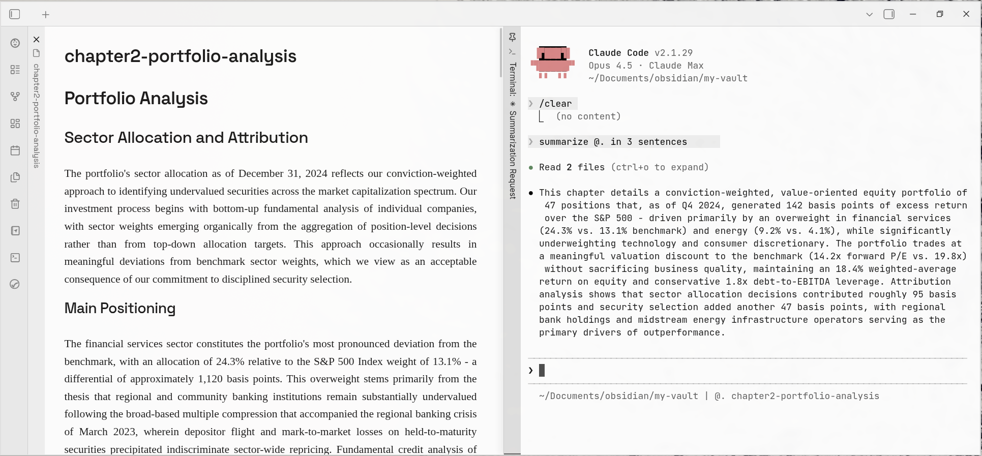 - "Summarize @." — Claude reads the pointer file, opens the active note, and summarizes it.