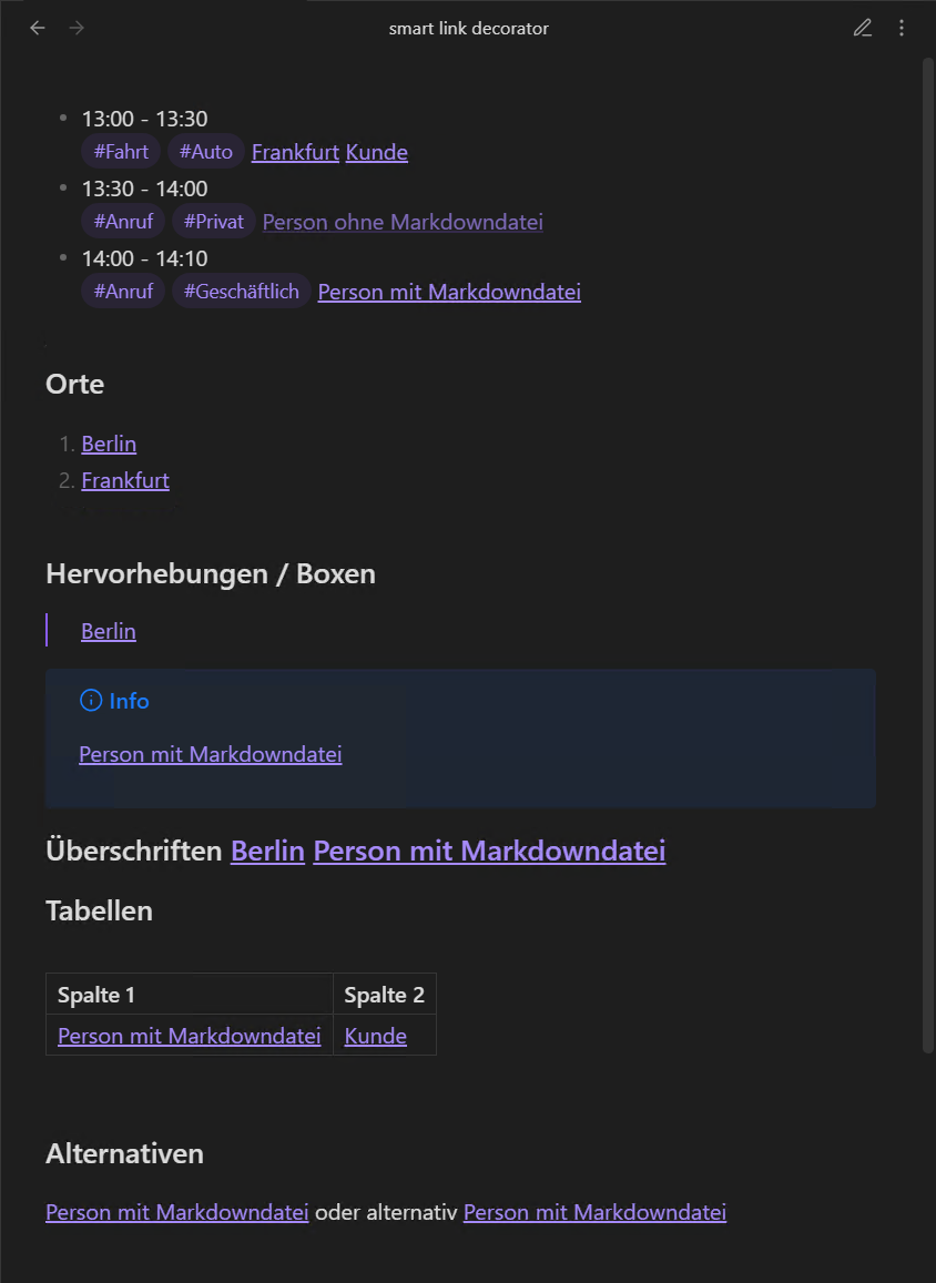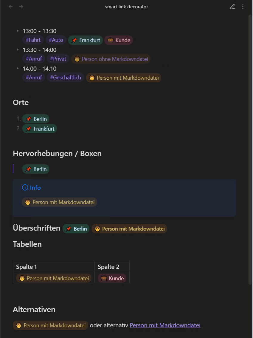 The Smart Link Decorator plugin makes internal Obsidian links that use aliases more intelligent by automatically enriching them with relevant additional information.