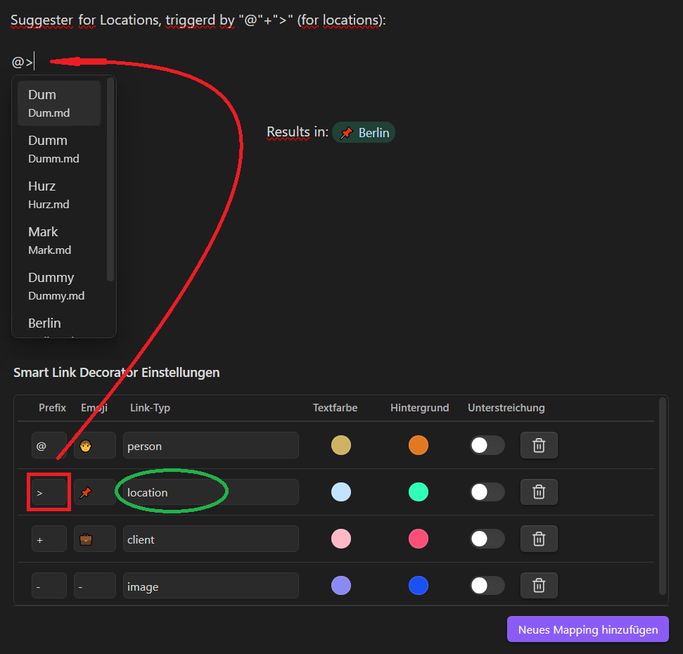 When typing @<prefix><characters>, the editor automatically opens a suggestion list that is filtered to notes matching the link type defined by @<prefix>. This makes it possible to create internal links quickly while ensuring that only contextually relevant notes are suggested.