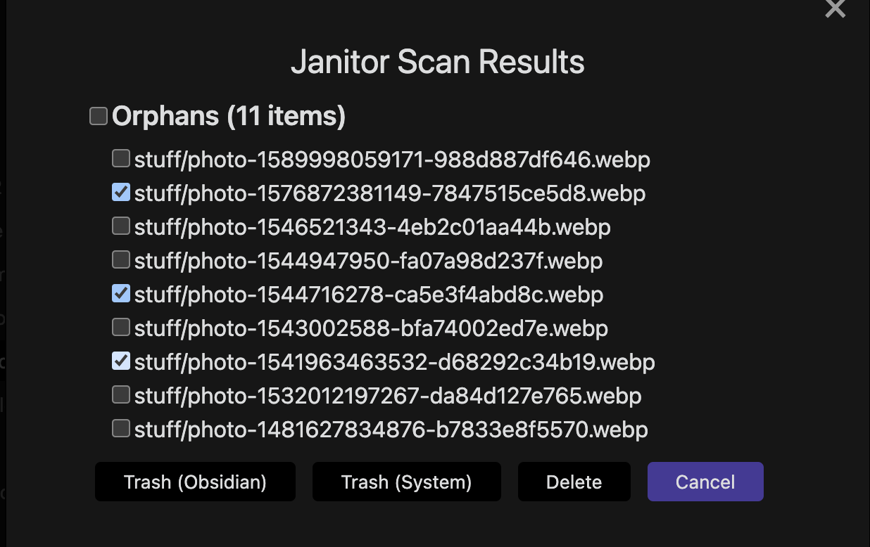 Cleaning service could be set to run at startup. If "ask confirmation" is set, it will prompt the user with a confirmation dialog. User can select which files to delete and which action to perform (trash in Obsidian, trash in OS or delete permanently).