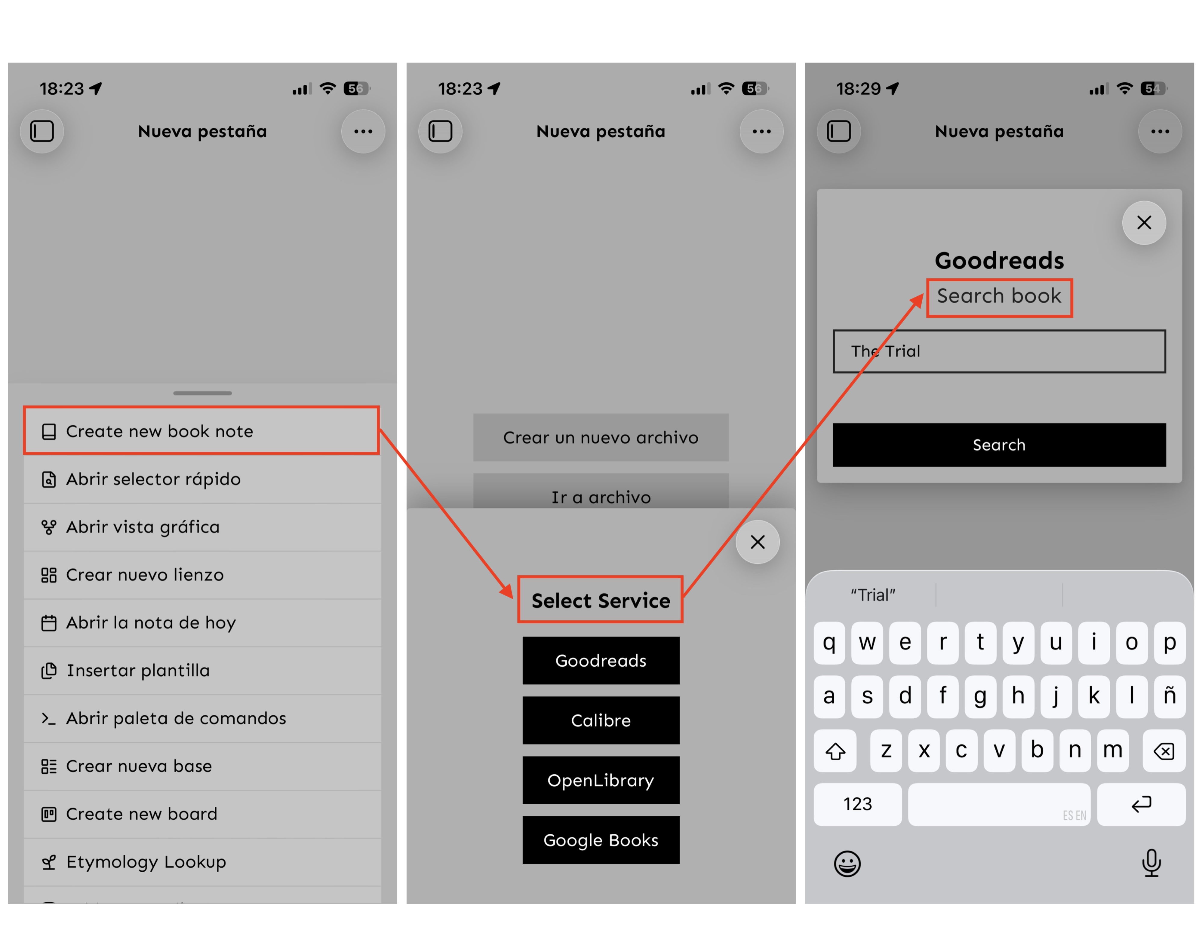 Search for books in Google Books, Goodreads, Open Library and local Calibre libraries to create notes.